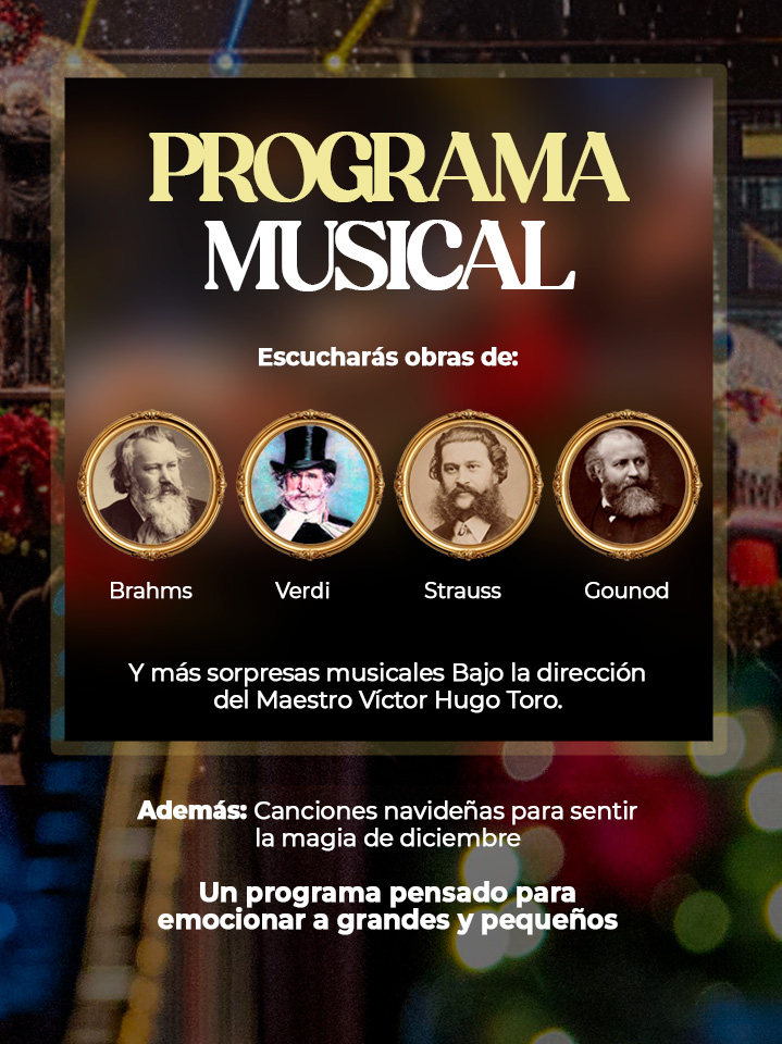 El programa considera la participación solista de la soprano Pilar Garrido, el tenor Rony Ancavil y la violinista Daira González, para interpretar un variado programa compuesto por obras de Brahms, Gounod, Lehar, Verdi, Bruch, Strauss y tradicionales melodías navideñas.
