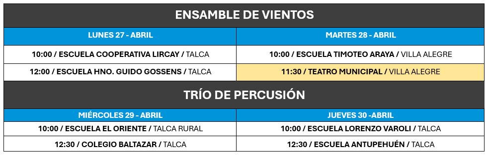 En esta oportunidad, las comunidades educativas podrán apreciar la interpretación de un ensamble de vientos y un trío de percusión, los que se presentarán de la siguiente manera.